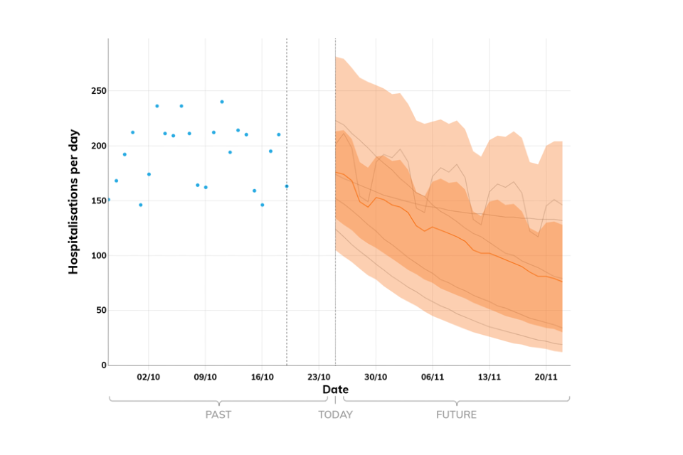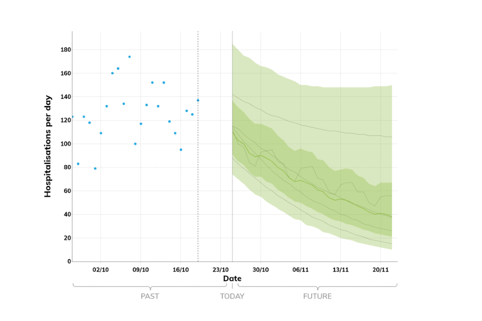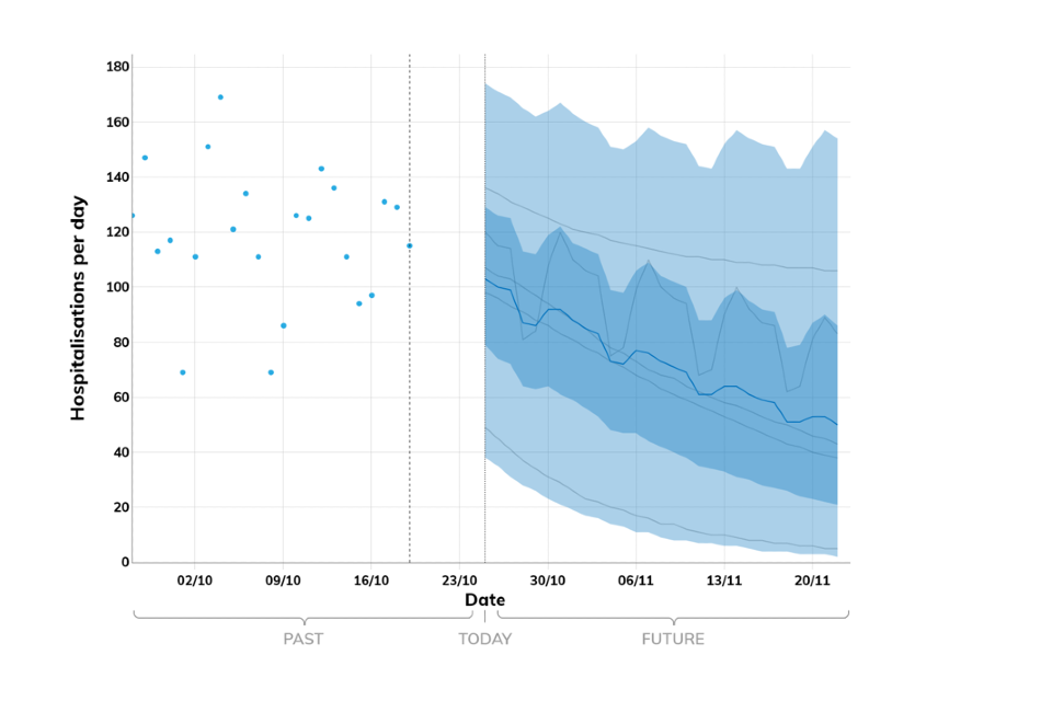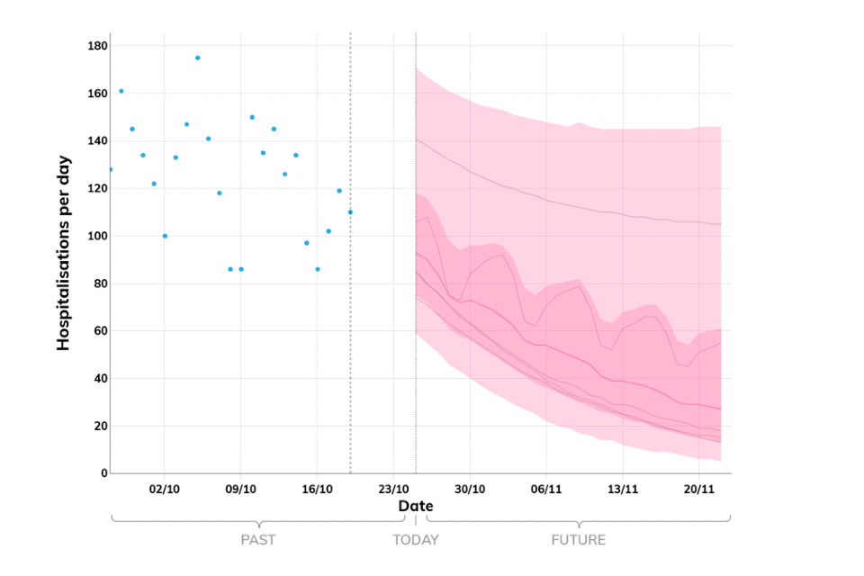 Projections do not include the potential effects of any novel variants. The delay between infection, developing symptoms, the need for hospital care, and death means it is unlikely that a novel variant will significantly alter the trajectories of hospitalisations and deaths in the timescales covered by these projections.