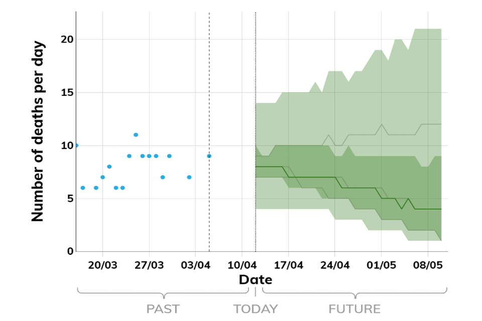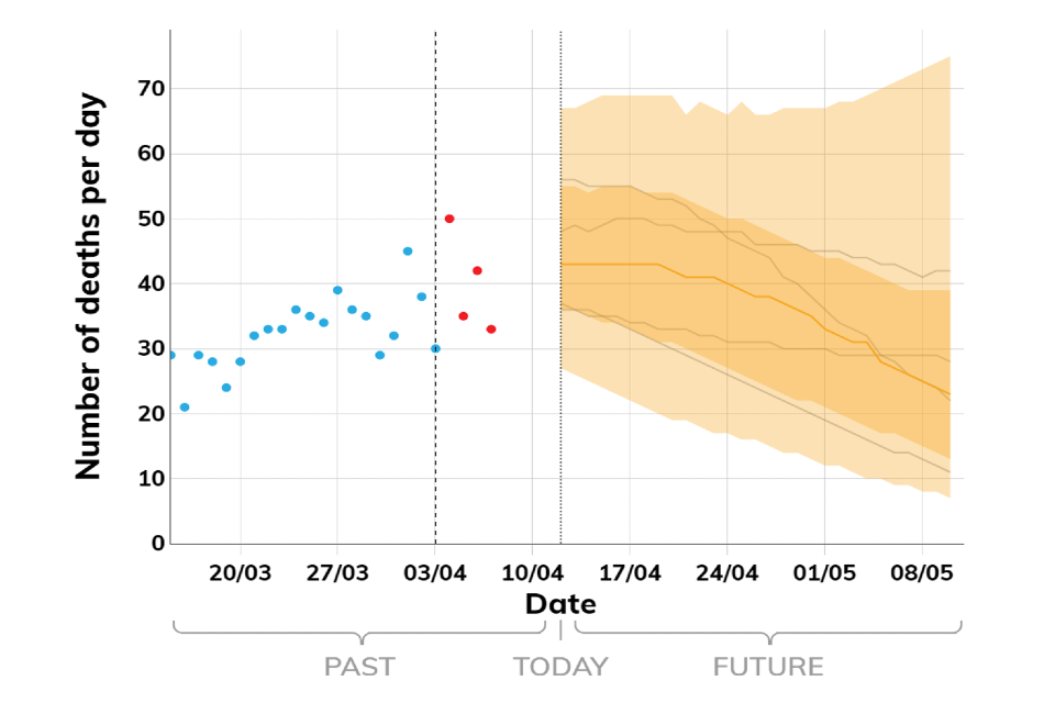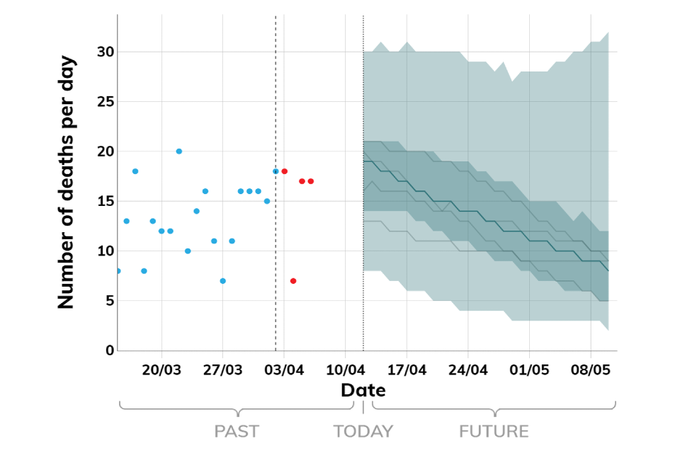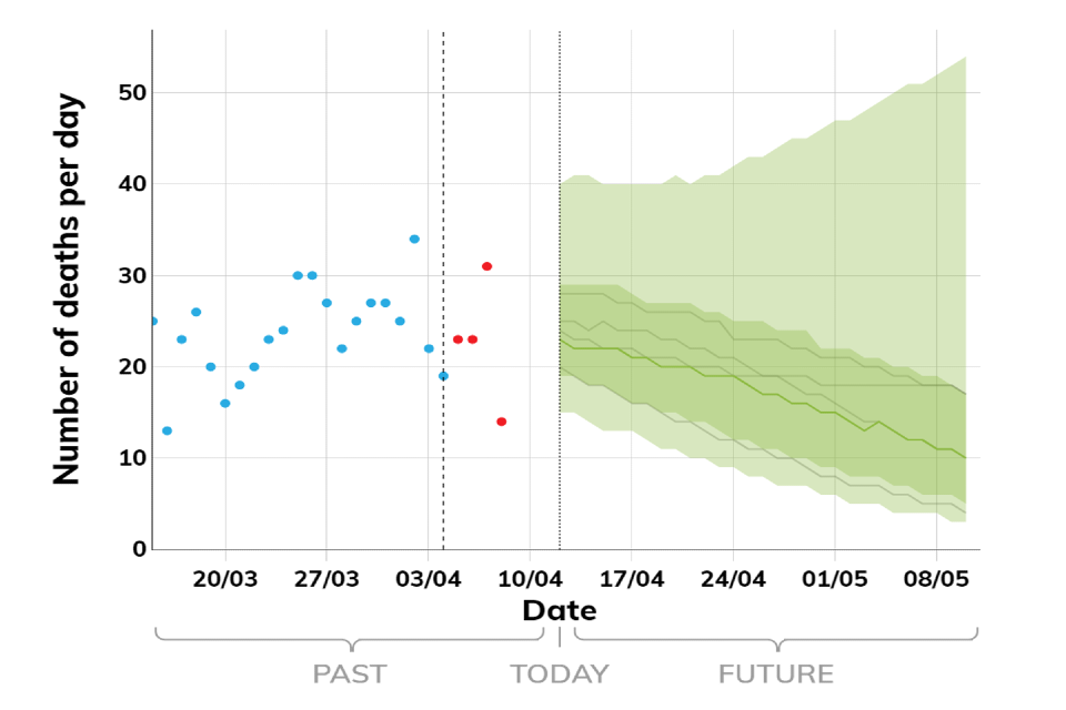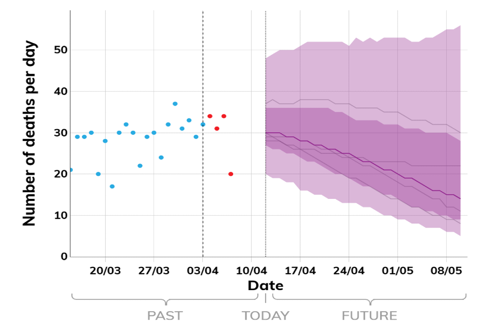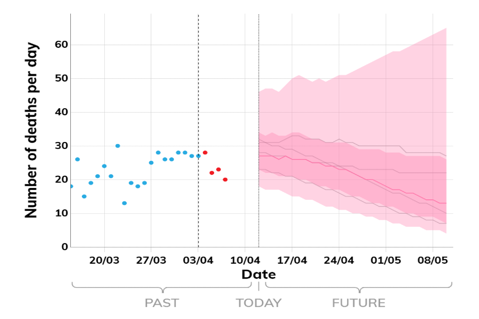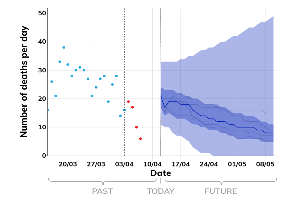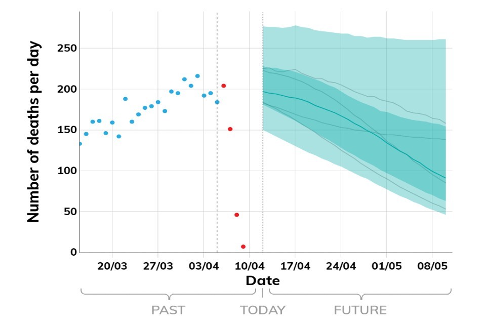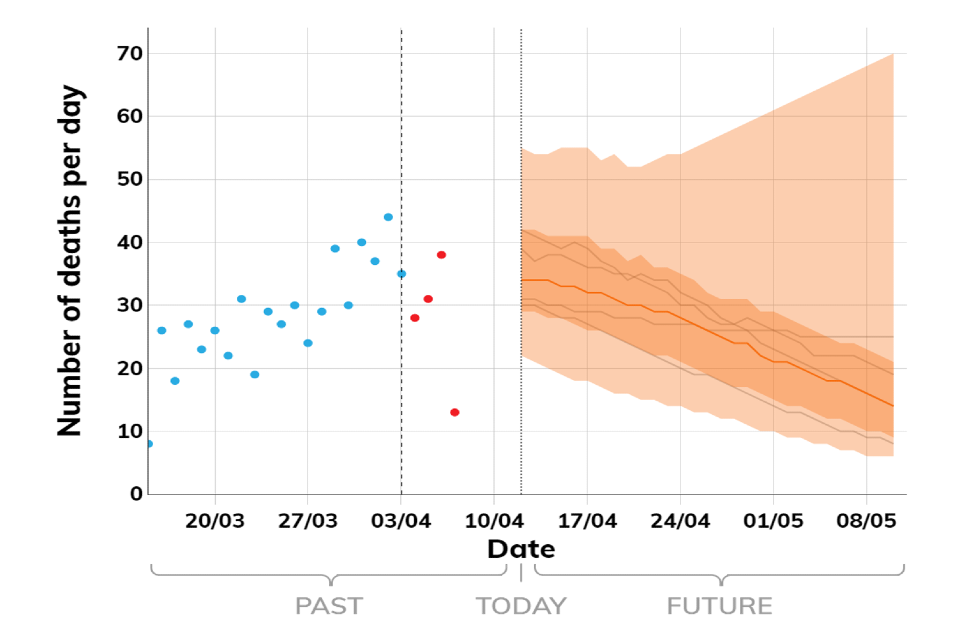 Figure 2c. Modelled projections of COVID-19 deaths per day (by date of death) in the UK nations based on trends to 11 April 2022