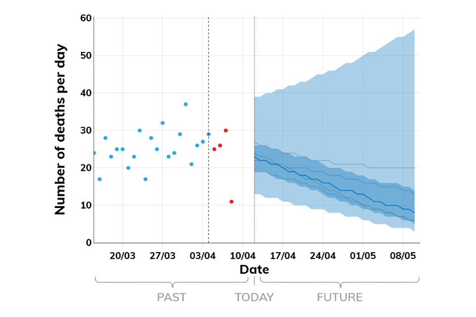 The number of COVID-19 deaths (by date of death) within 28 days of being identified as a COVID-19 case. Past data for Scotland, Wales, and Northern Ireland is taken from the Coronavirus (COVID-19) in the UK dashboard on GOV.UK. The figure has minor adjustments for publication to prevent statistical disclosure.
