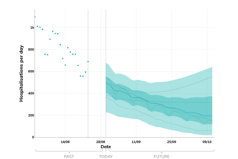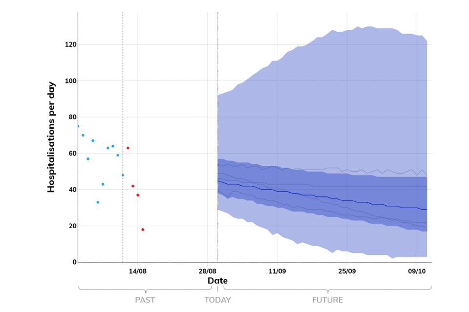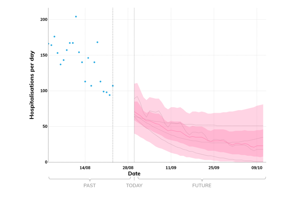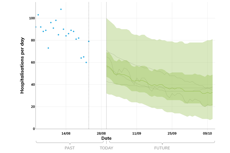 Projections do not include the potential effects of any novel variants. The delay between infection, developing symptoms, the need for hospital care, and death means it is unlikely that a novel variant will significantly alter the trajectories of hospitalisations and deaths in the timescales covered by these projections.
