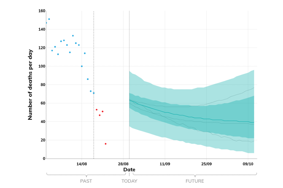 Figure 2. Modelled projections of COVID-19 deaths per day (by date of death) in the UK nations based on data available on 24 August 2022