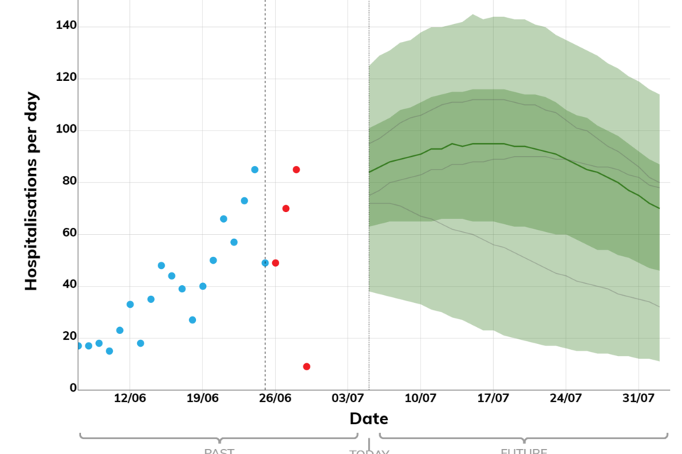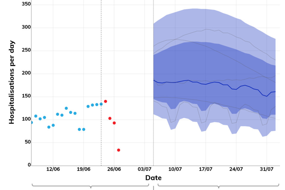The delay between infection, developing symptoms, the need for hospital care, and death means the MTPs cannot fully reflect the impact of policy and behavioural changes in the 2 to 3 weeks prior to 4 July 2022. An assumed effect of school holidays has been included.