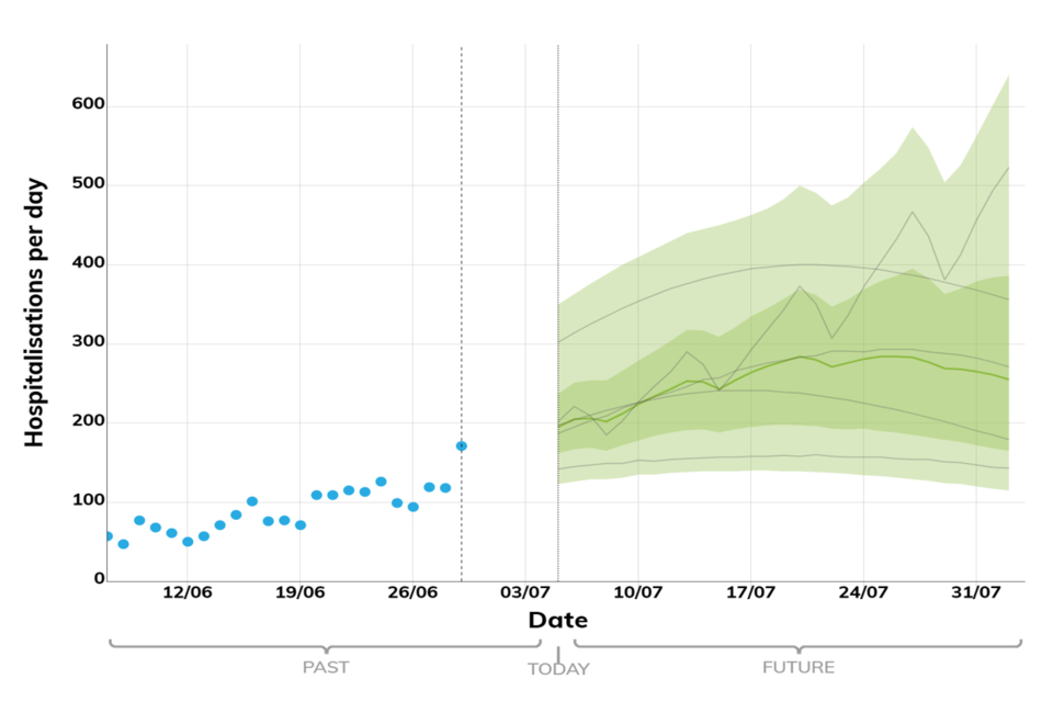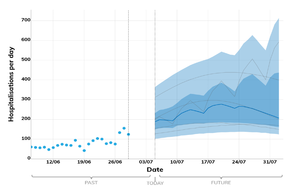 These medium-term projections (MTPs) for COVID-19 hospitalisations ± and deaths ¥ are not forecasts or predictions. They represent a scenario in which the trajectory of the epidemic continues to follow the trends that were seen in data available to 4 July 2022.