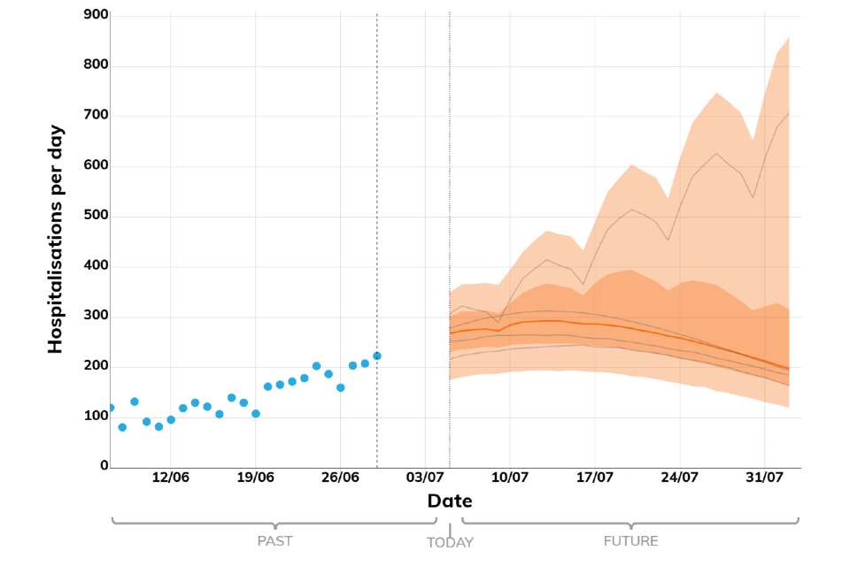 Projections do not include the potential effects of any novel variants. The delay between infection, developing symptoms, the need for hospital care, and death means it is unlikely that a novel variant will significantly alter the trajectories of hospitalisations and deaths in the timescales covered by these projections.