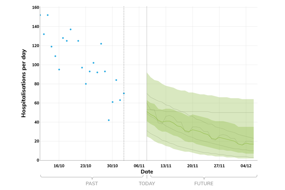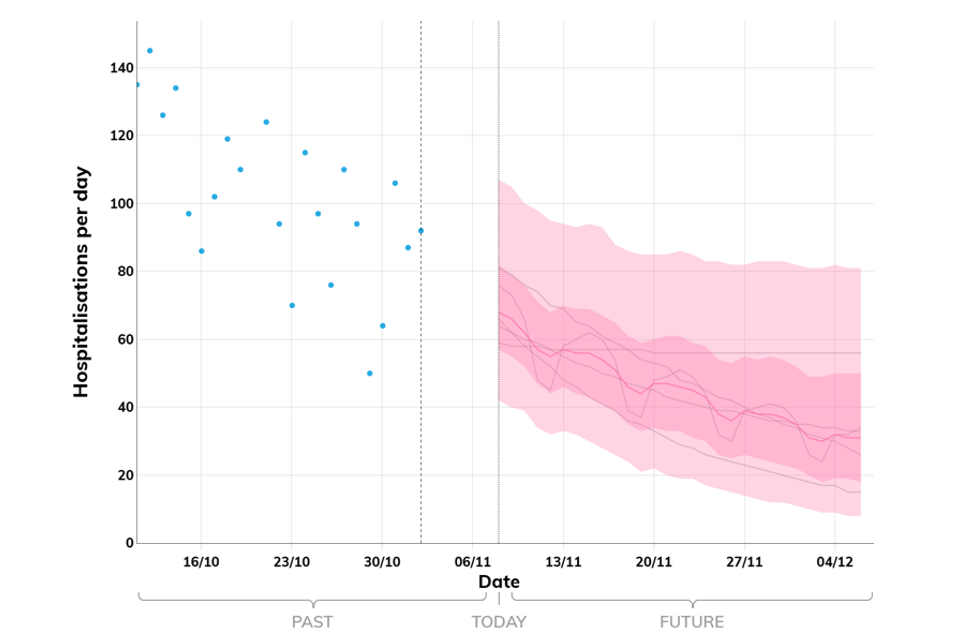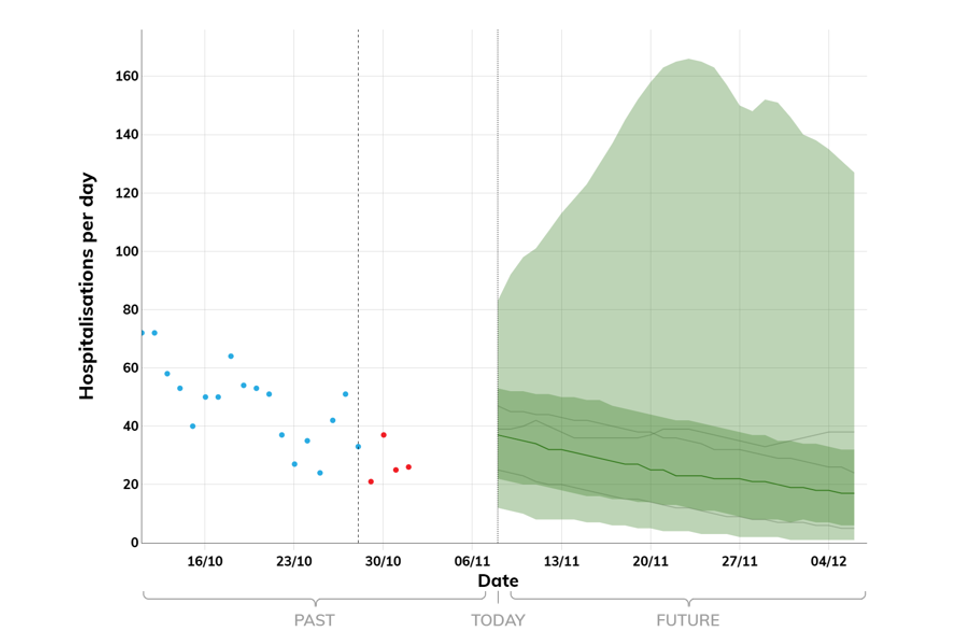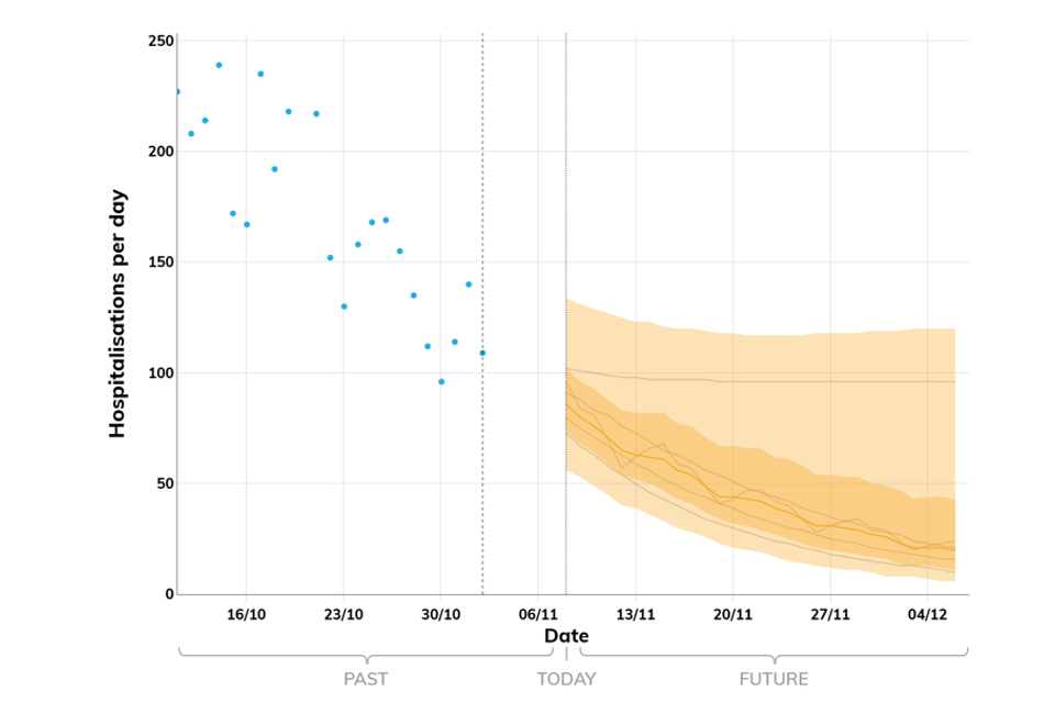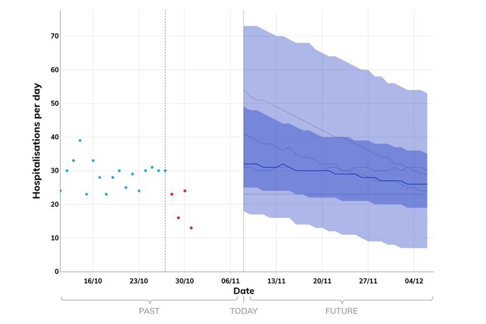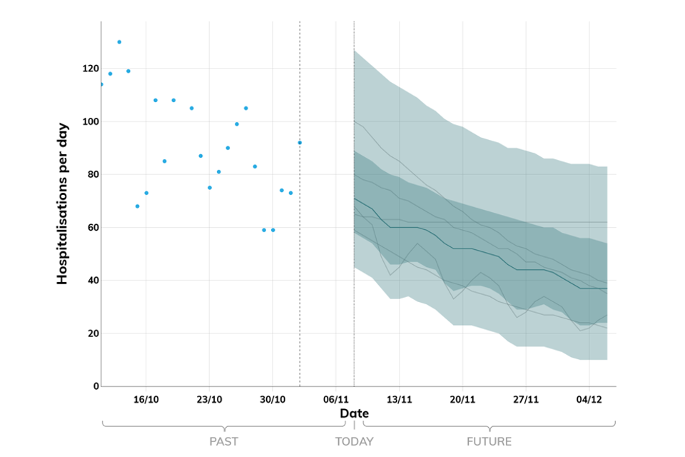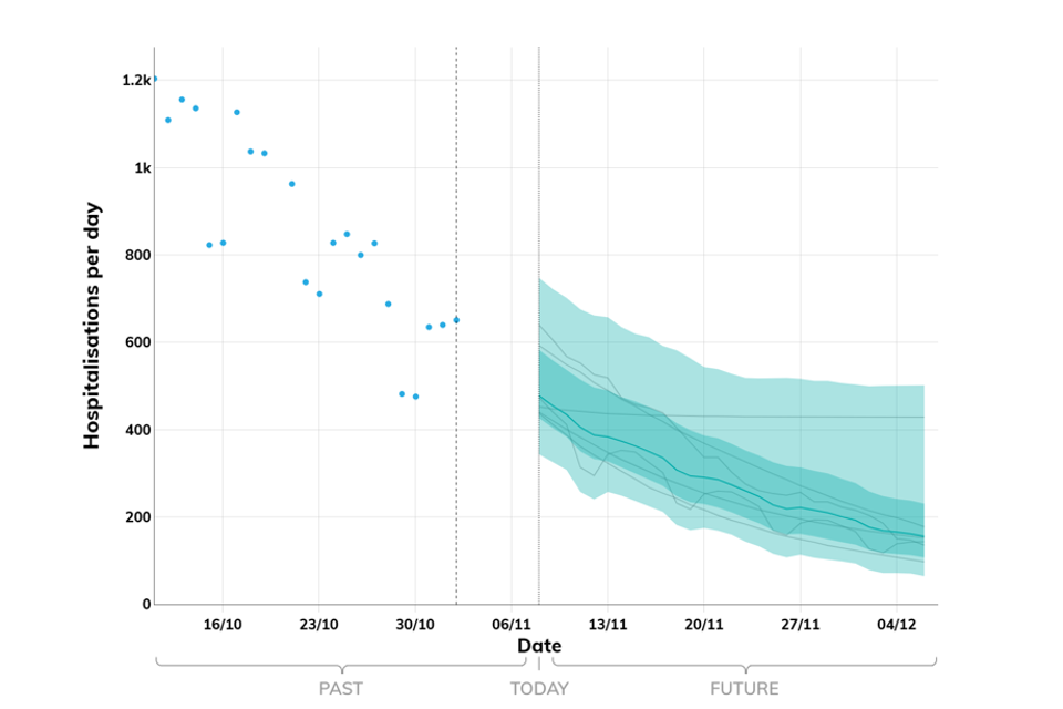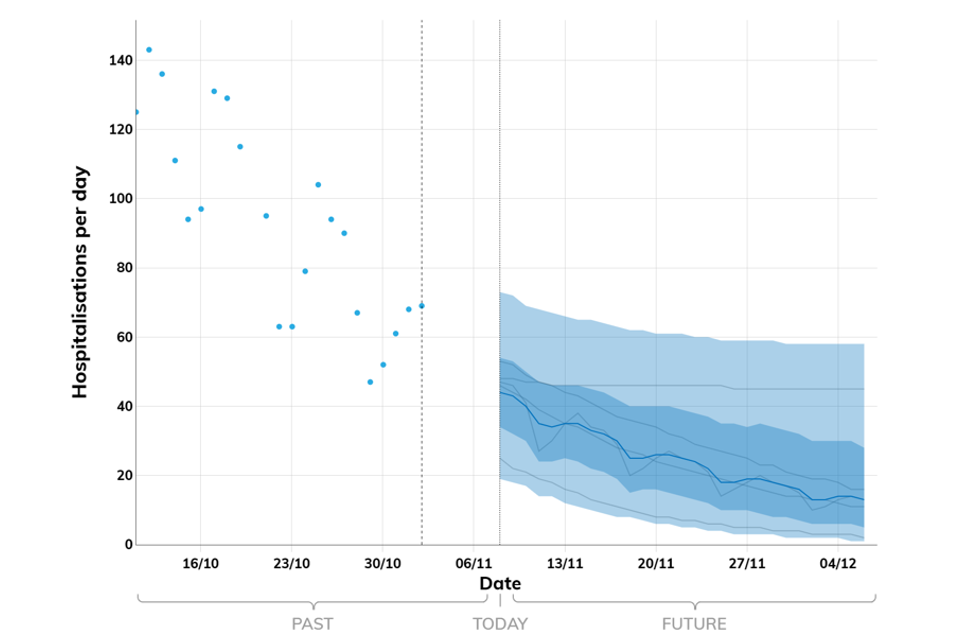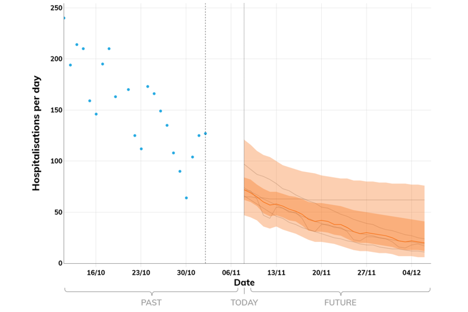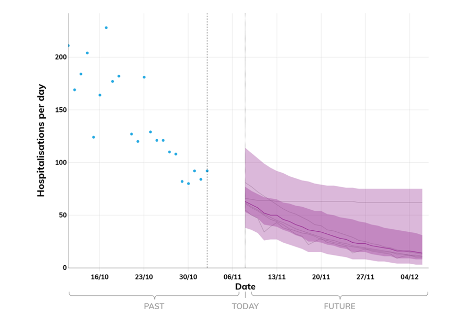 Projections do not include the potential effects of any novel variants. The delay between infection, developing symptoms, the need for hospital care, and death means it is unlikely that a novel variant will significantly alter the trajectories of hospitalisations and deaths in the timescales covered by these projections.