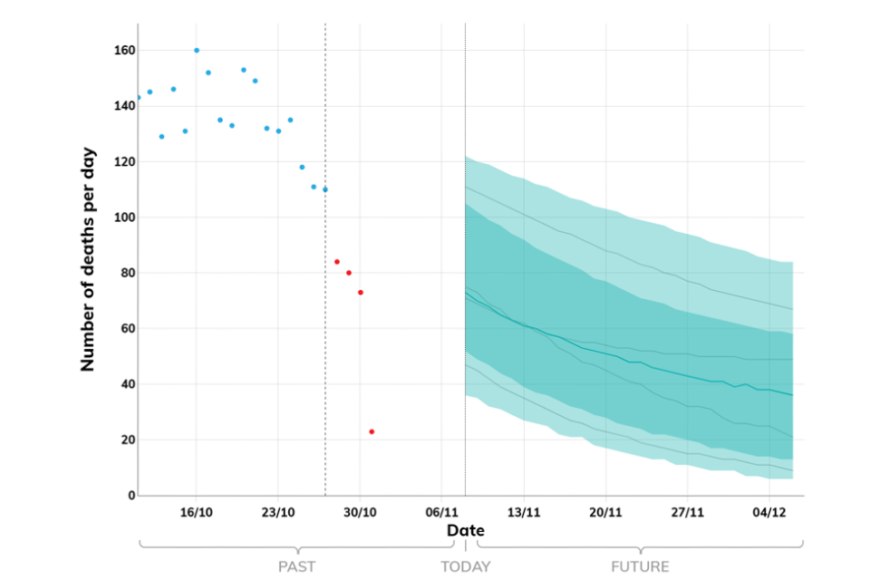 Figure 2. Modelled projections of COVID-19 deaths per day (by date of death) in the UK nations based on data available on 3 November 2022