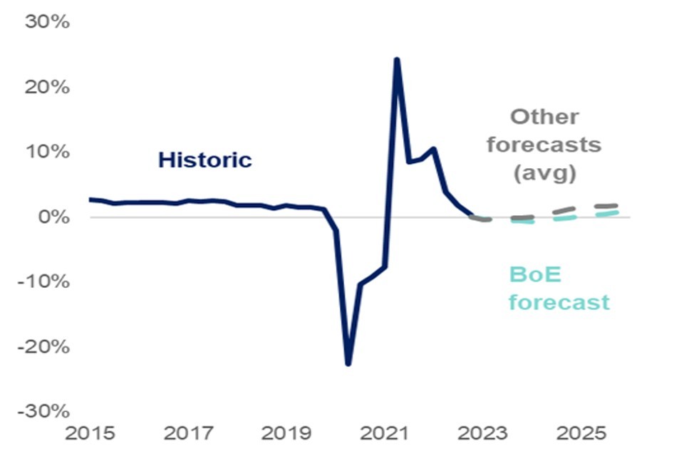 Gross domestic product (GDP) is expected to decrease slightly across 2023 and most of 2024, according to the most recent Bank of England (BoE) forecasts illustrated in Figure 2.1. This qualifies as a technical recession – 2 consecutive quarterly decreases in GDP. This decline in output is however less substantial than previously forecast, reflecting recent strength in the labour market. Other forecasters expect a similar GDP decrease in early 2023 but expect slightly higher growth beyond this.