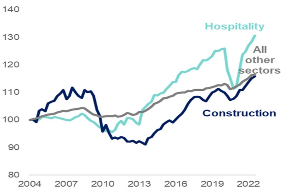 Figure 3.1: Indexed employee jobs in construction and hospitality, 2004-2022 (Q1 2004=100)