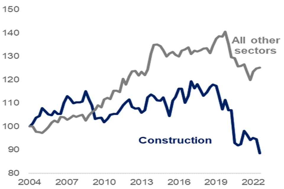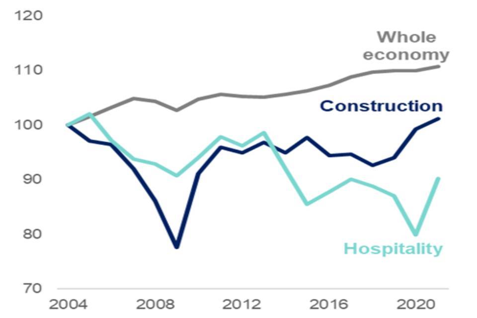 Figure 3.8: Real output per hour worked in construction and hospitality, 2004-2021 (2004=100)