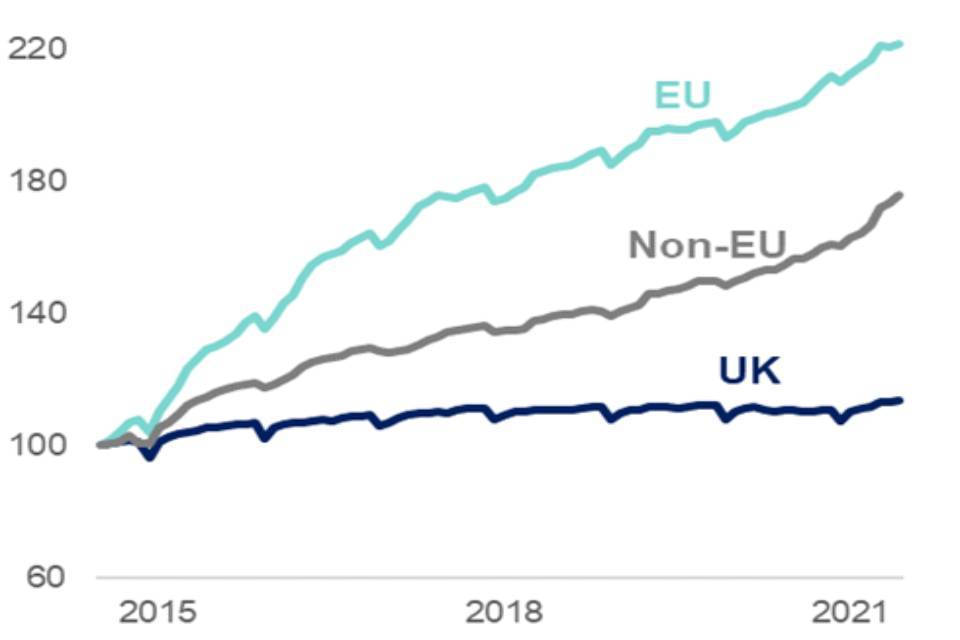 Source: HMRC Payrolled employments in the UK by industry and nationality, monthly data July 2014-June 2021.
