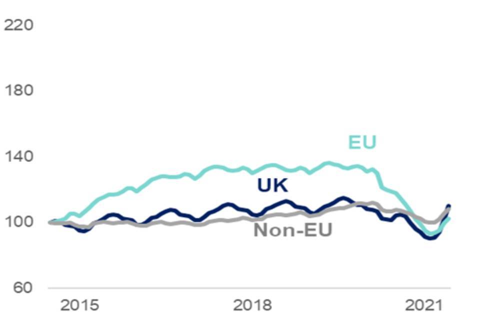 Figure 3.4: Indexed employments by nationality for hospitality July 2014-June 2021 (July 2014=100)