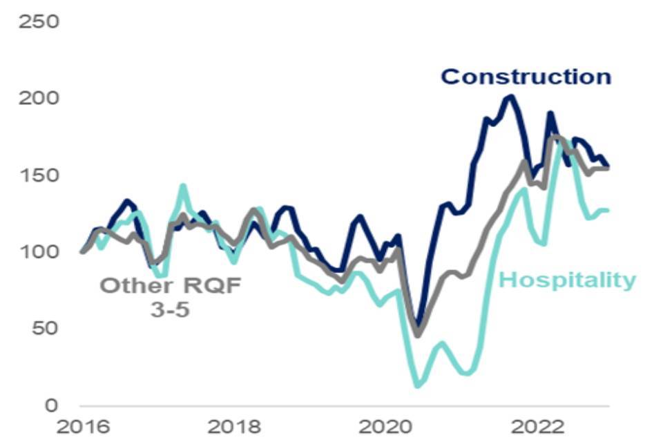Figure 3.6: Indexed job postings in RQF 3-5 occupations in construction and hospitality, 2016-2022 (Jan 2016=100)