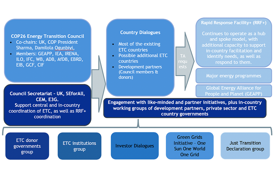 The ETC Secretariat will support decision-making for the ETC and coordination with other initiatives and bodies. It will deliver a set of functions for central and in-country coordination of ETC countries, partners and institutions. It will also be tasked with the management of the Rapid Response Facility. We anticipate that this will be supported by increased ownership of the in-country process by ETC institutions and partners. To date, a small group has been supporting the UK Government in the Secretariat function, including Sustainable Energy for All (SEforAll), the Clean Energy Ministerial (CEM) and Third Generation Environmentalism (E3G) – and they will continue to do so.