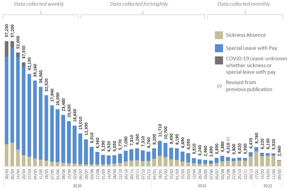 Bar chart time series showing number of COVID-19 related absences in the Civil Service: March 2020 – May 2022