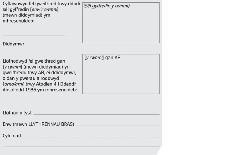 “(Dyddiad) Trwy Benderfyniad dyddiedig 2 Chwefror 1996 penodwyd Gwenllian Hywel o 54 Lôn Cadwaladr, Dolystwyth, Sir Digonedd KV3 8NR yn ddatodwr XYZ Cyfyngedig, perchennog yr Arwystl dyddiedig 25 Mawrth 1999 y cyfeirir ato uchod.”