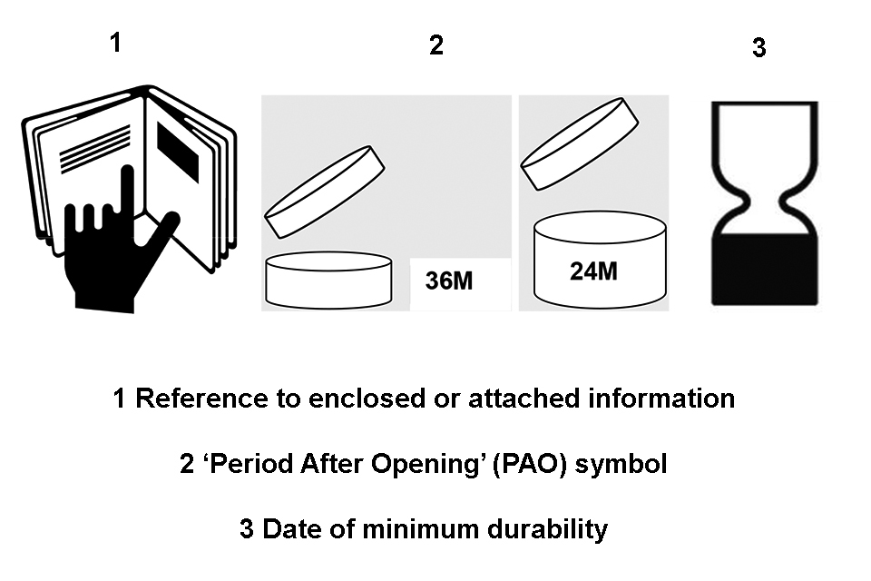 Symbols for reference to enclosed or attached information, Period After Opening (PAO), and date of minimum durability.