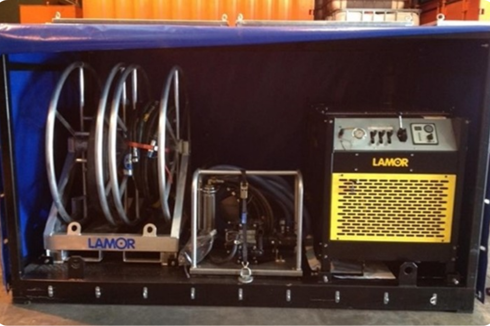 The unit comprises a skid mounted diesel driven power pack, pump set and reels with hoses.