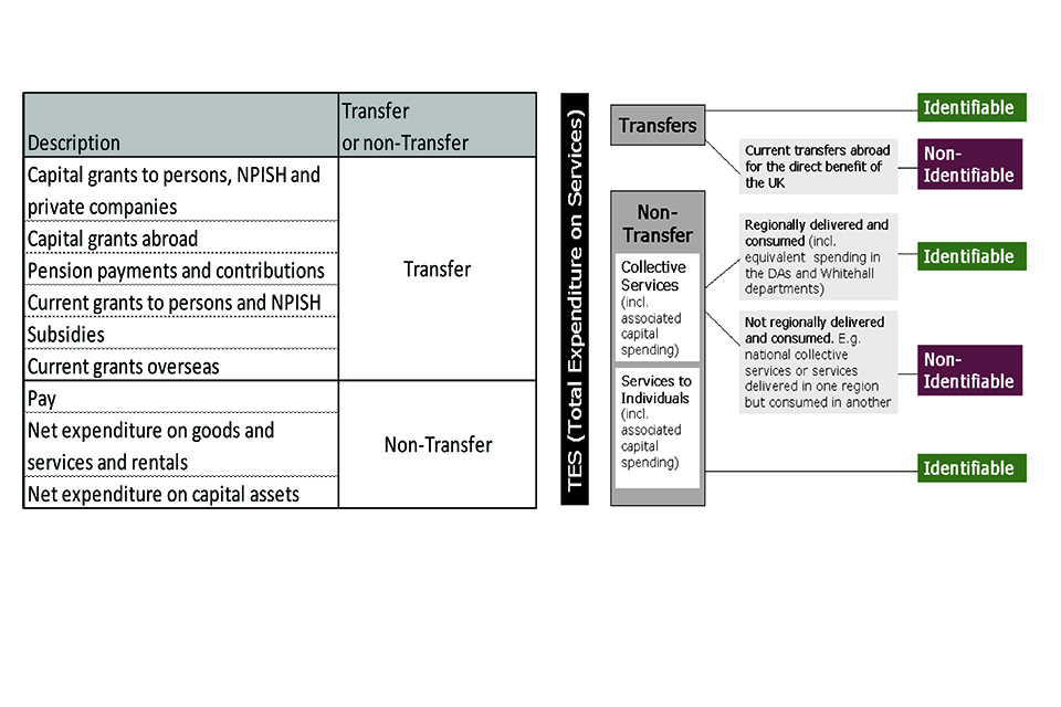 Other current spending (on goods and services, which includes employment costs) takes the form of spending on services that are either ‘services to individuals’, which are by definition identifiable; or ‘collective services’ which, where they are delivered nationally, are not identifiable as benefiting individual regions. The distinction between services to individuals and collective services is set out in the European System of Accounts (ESA2010), which sets the framework for the UK National Accounts.