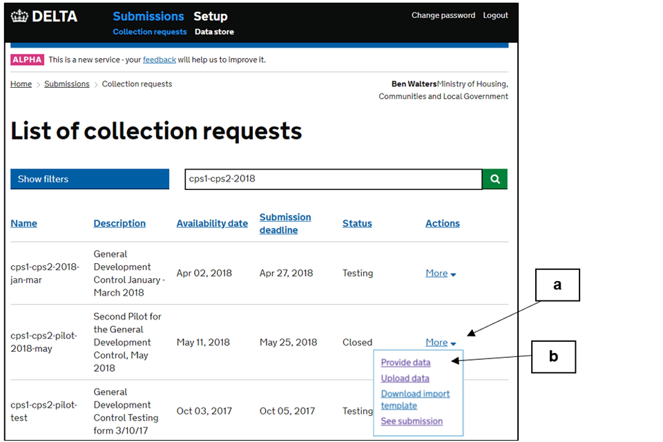Note: In the example above, the selected form would refer to the CPS1/CPS2 pilot form of May 2018, with collection between 11 May and 25 May.