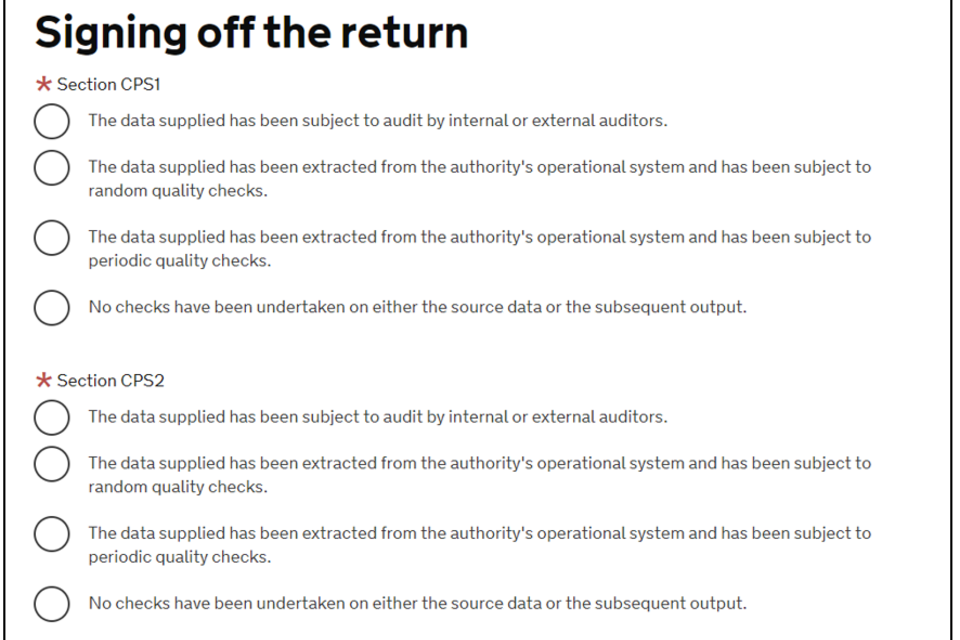 As the notes within the form (pictured above) suggest, entering a non-zero answer for this question will cause Questions 3 and 4 to appear, as well as the CPS2 form. Questions 3 and 4 will appear directly below Question 2, while CPS2 will appear at the end of the form (prior to the sign off section). If neither appear, then please wait a moment while the form fully loads.