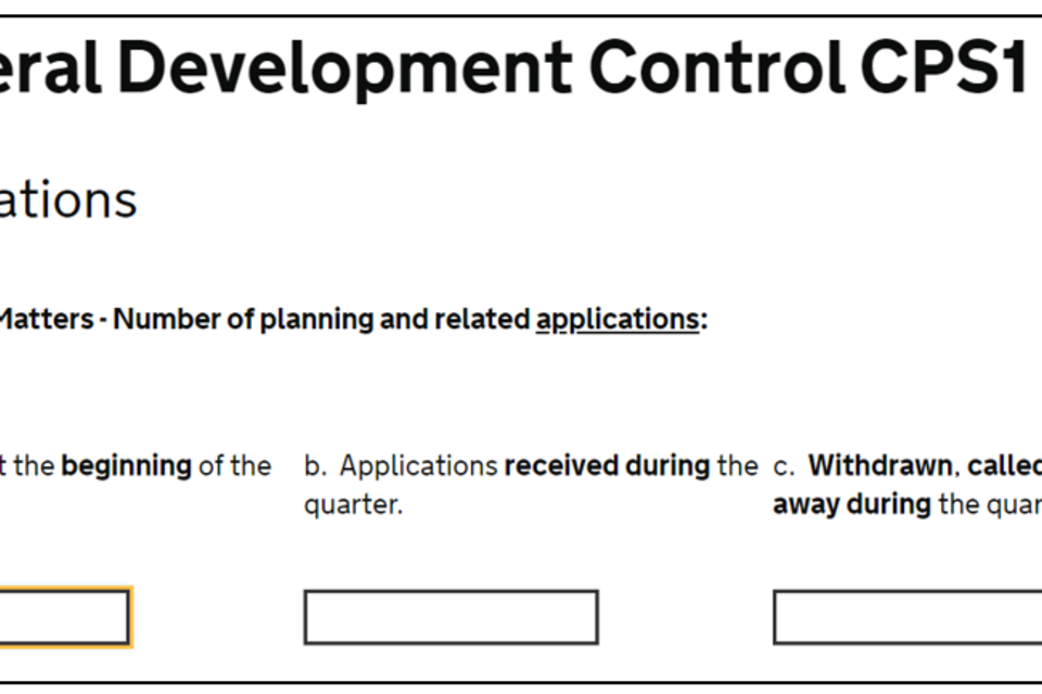 The CPS1 form is concerned with county matter applications and collects summary information about the number of planning and related applications on hand at the beginning of the quarter, received, withdrawn, called in or turned away during the quarter; the number of decisions and delegated decisions; and information on specific types of applications such as applications accompanied by Environmental Statements, Regulation 3 and 4 consents, decisions on applications for prior approval, determinations applications and enforcement action.
