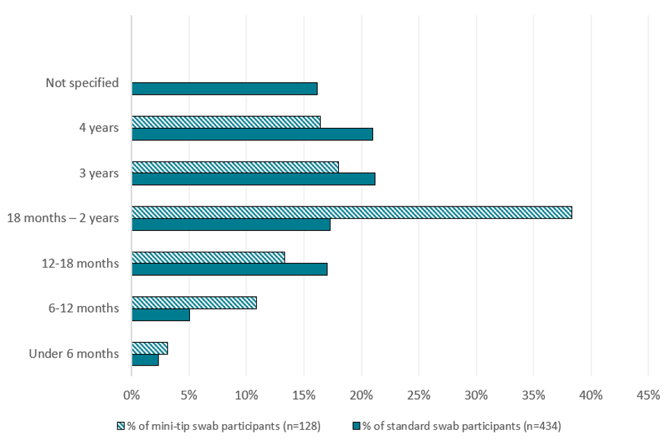 The most common age (over a third) for those who used mini-tip swabs was 18 months to 2 years. For standard swabs, the most common age was both 3 and 4 years (accounting for over 20% each). The least common age for both tests were participants under 6 months old.