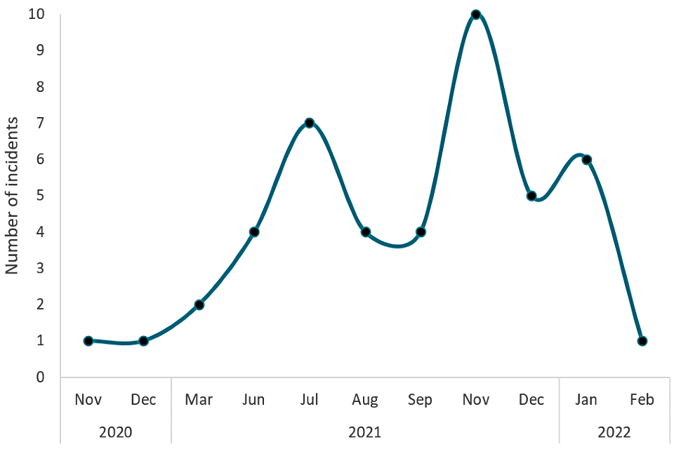 The above line graph shows the number of incidents reported each month from November 2020 to February 2022 for children under 5 years of age. The y-axis shows the number of incidents from 0 to 10. The x-axis shows the month. November and December 2020 and February 2022 show the fewest incidents (1). November 2021 had the highest number of incidents (10).