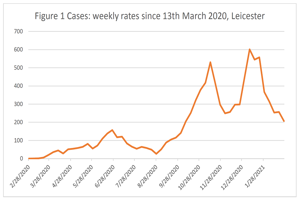 Figure 1: Cases: Weekly rates since 13 March 2020, Leicester. Source: derived from data downloaded from UK Coronavirus Dashboard on 2 March 2021.