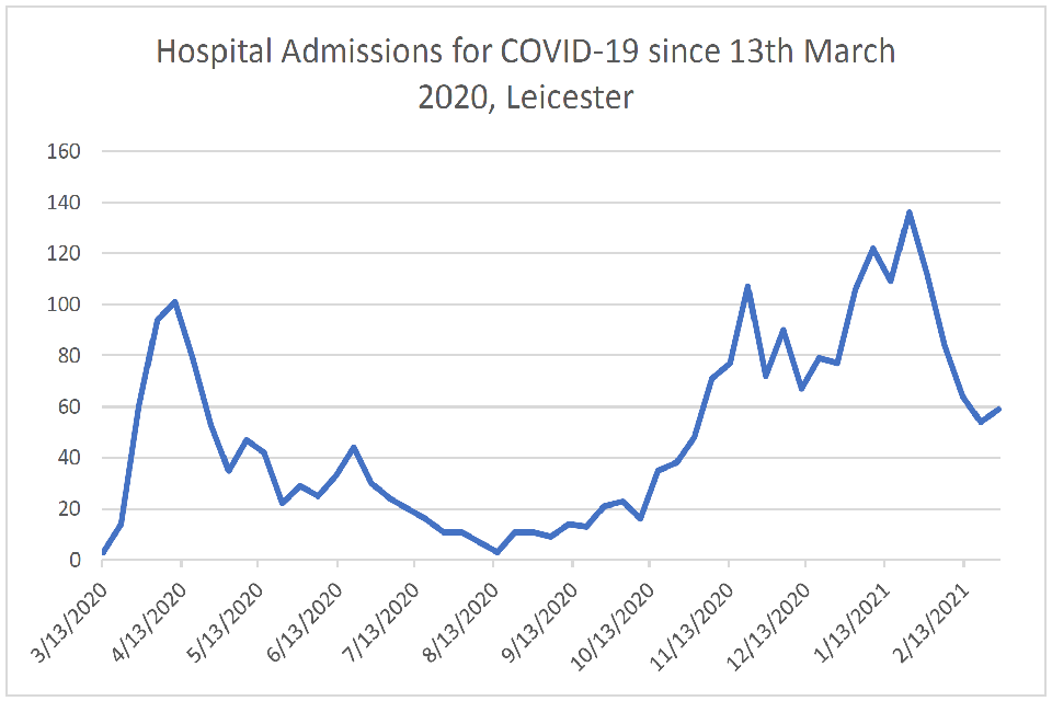 Figure 1a: Hospital Admissions for COVID-19 since 13 March 2020, Leicester. Source: derived from data downloaded from: UK Coronavirus Dashboard on 2 March 2021.