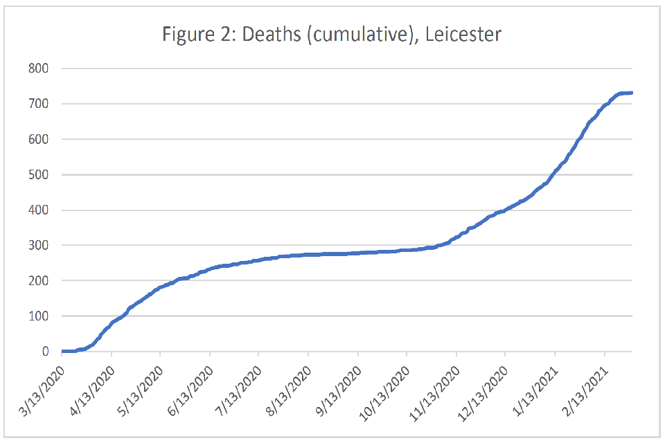 Figure 2: Deaths (cumulative), Leicester. Source: derived from data downloaded from: UK Coronavirus Dashboard on 2 March 2021.