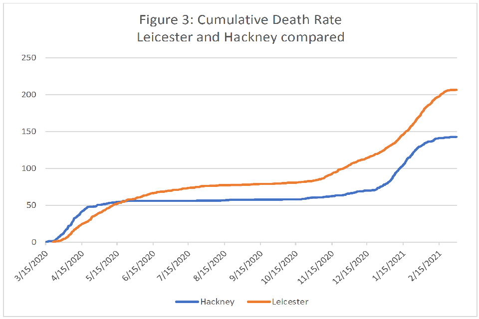 Figure 3: Cumulative Death Rate Leicester and Hackney compared. Source: derived from data downloaded from: UK Coronavirus Dashboard on 2 March 2021.