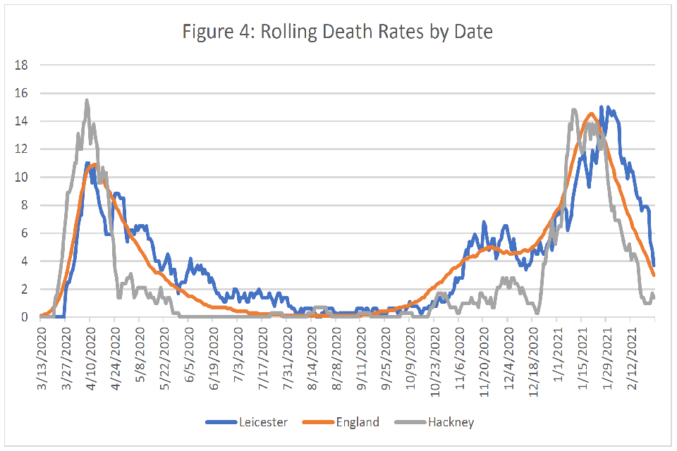 Figure 4, rather than looking at the cumulative total, looks at the rolling death rate (namely the rolling 7-day average). This shows how the rate in the more recent period exceeded that for the earlier period. Again, a comparison with Hackney shows how the patterns across the 2 areas differ. The England rolling rate is also included for reference. The rate in Leicester is clearly to the right of that for Hackney with a lower initial peak but slower decline, including some upticks. Note that Leicester was put into lockdown on 26 June, by which time its rolling rate had been above that for England for a few weeks. Leicester experienced a higher second peak than Hackney and then a later third peak.