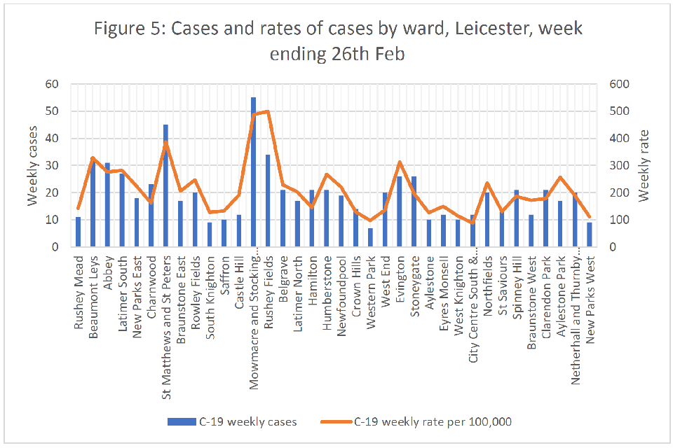 Figure 5: Cases and rates of cases by ward, Leicester, week ending 26 February. Source: derived from data downloaded from: Open Leicester on 2 March 2021.