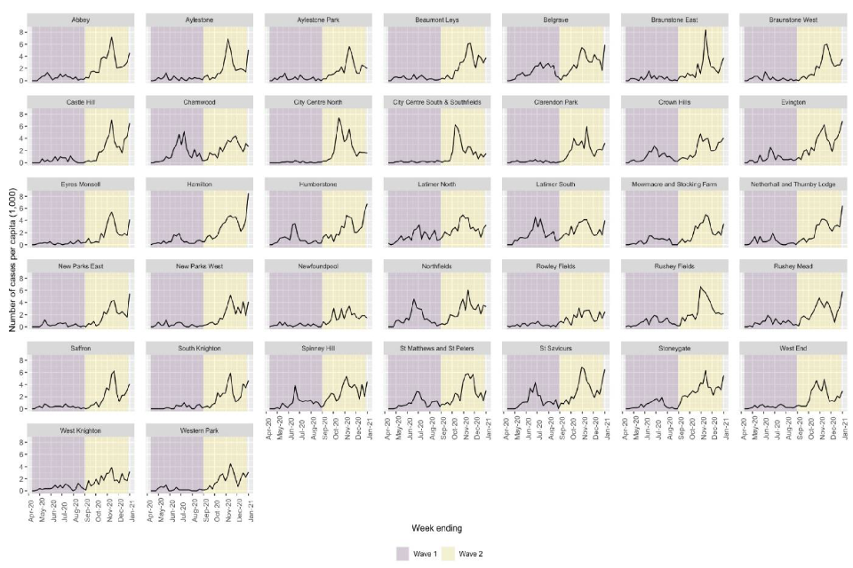 In addition we have plotted local public health case date per week per 1000 according wards in Leicester from 20 April to 21 January.