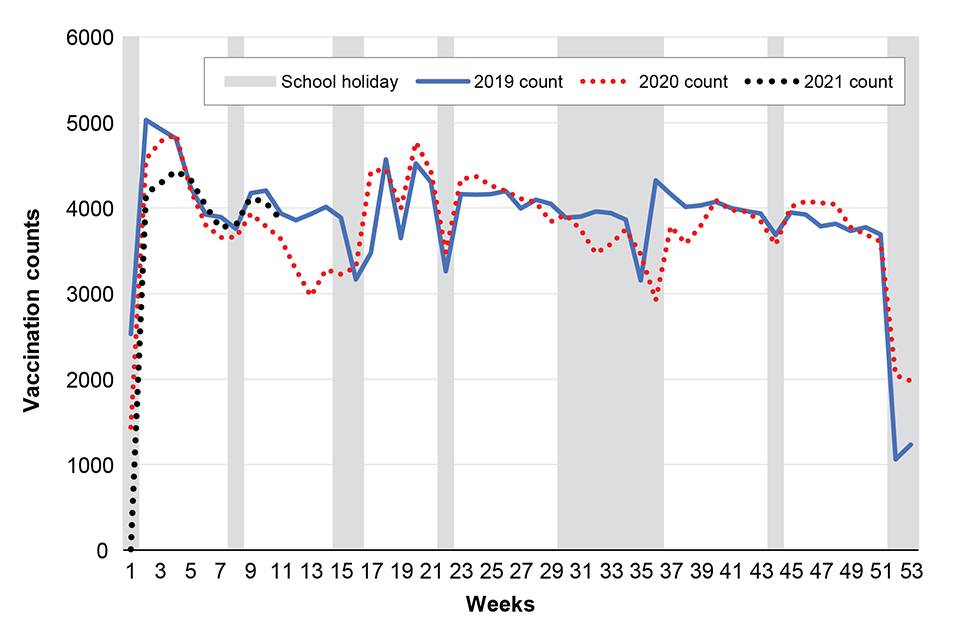 Impact of COVID-19 on childhood vaccination counts up to week 11, 2021