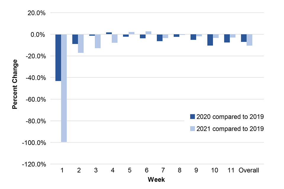 Percentage change in vaccination counts in 2021 and 2020 compared with 2019, to week 11
