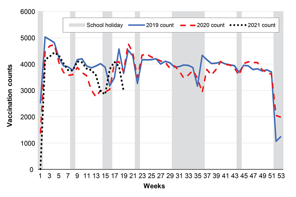 Impact of COVID-19 on childhood vaccination counts up to week 19, 2021