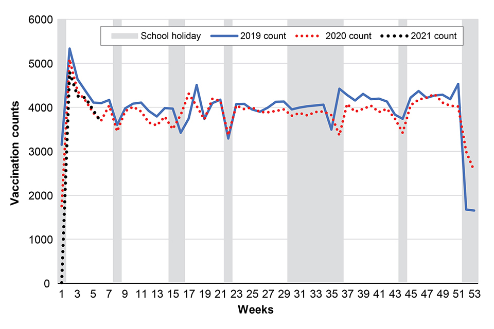 - the number of dose 1 MMR vaccine doses delivered in England in week 6 (Figure 2) were higher than during the same week in 2019 and 2020, although the overall difference in vaccination counts delivered in 2021 was lower than in 2019 and 2020 (Figures 2 and 4)