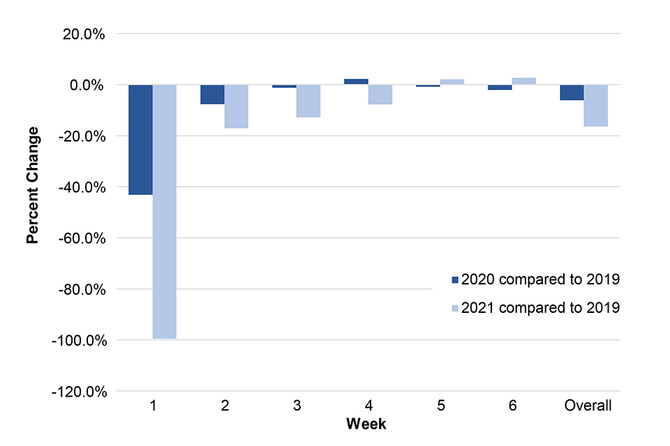 In figures 1 and 2 it should be noted that direct comparisons for the weekly data between 2019, 2020 and 2021 should be made with caution since the days do not map the same weeks (week 1 data for 2021 only accounts for 3 days). Also, that school holidays (often coinciding with family holidays) are for the 2020 calendar year. These holidays may vary slightly by year and by local area. School holidays for the 2019 to 2020 academic year were in weeks 43, 52, 53, 1, 8, 15, 16, 19, 22, 30 to 36. School holidays for the 2020 to 2021 academic year are in weeks 44, 52, 53, 7, 13, 14, 18, 22, 29 to 35.