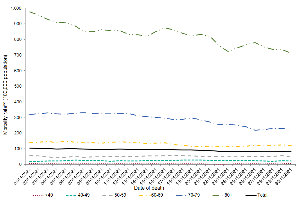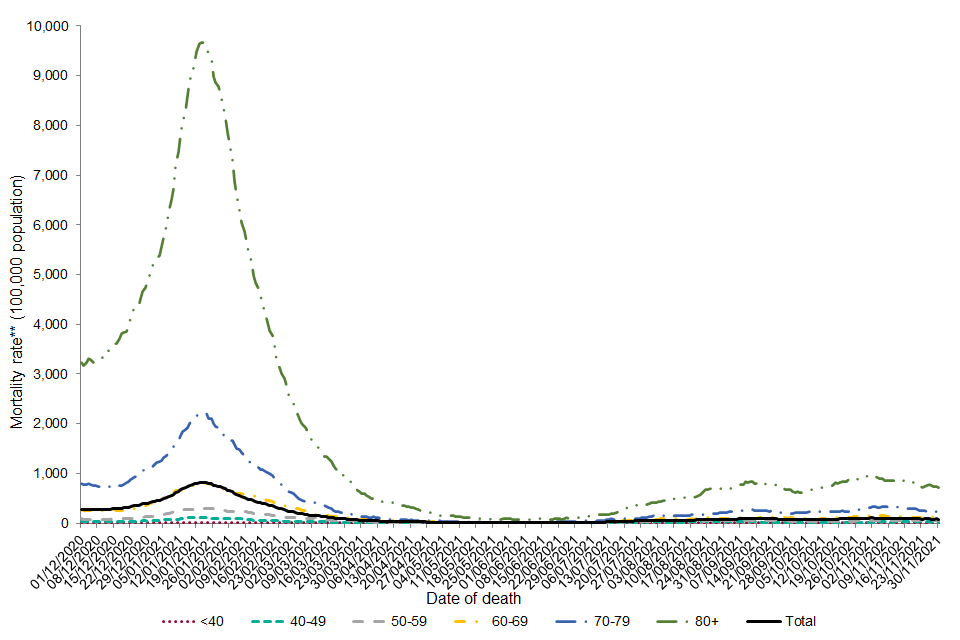 Since 1 December 2020, the mortality rate was highest among those aged over 80 (annualised rate of 1,767 per 100,000 population per year).