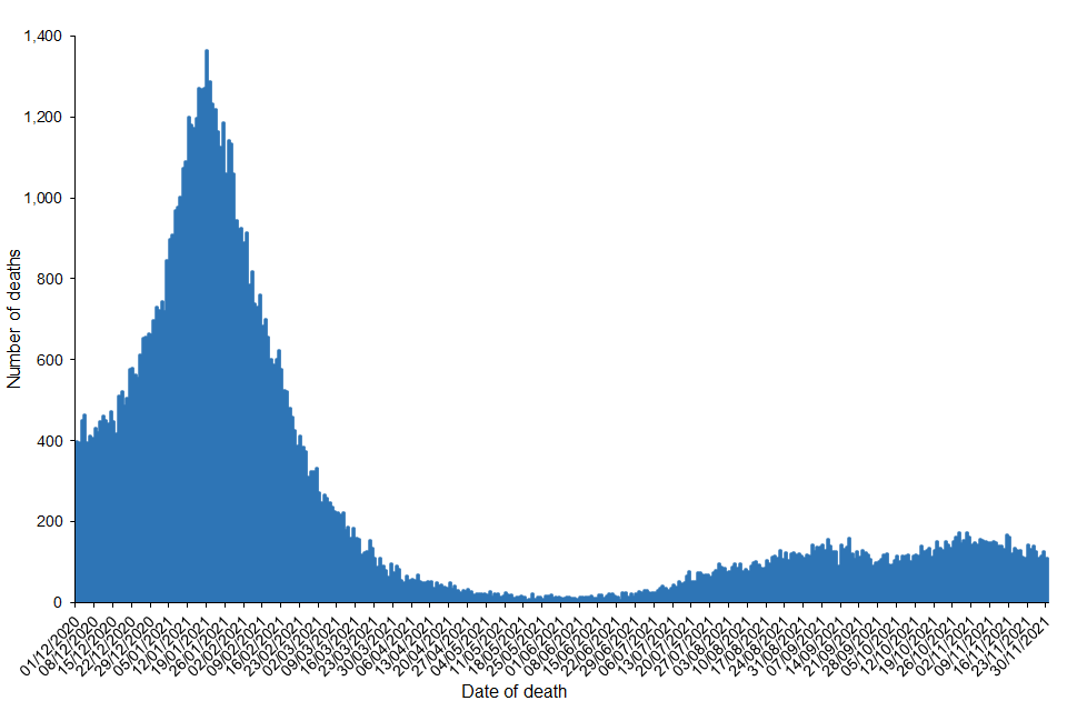 Within the period 1 December 2020 to 30 November 2021, 7,331,025 cases of COVID-19 were detected in England. In the same period, there have been 89,802 deaths in persons with laboratory-confirmed COVID-19. This represents a crude mortality rate of 159 per 100,000 population. From 1 December 2020 onwards, the highest recorded number of daily deaths was 1,364 deaths on 19 January 2021.