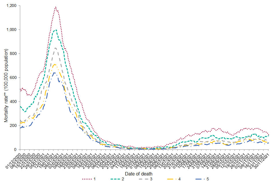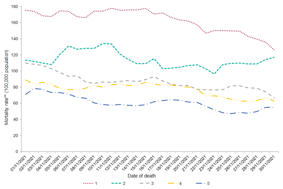 Relative deprivation was assessed using quintiles of the IMD linked to residential lower super output area, with IMD 1 representing the most deprived. Overall, from 1 December 2020, the age-adjusted annualised mortality rate is highest among those living in the most deprived areas, with a gradual decrease in mortality rate seen with decreasing deprivation. For the month of November 2021, the age-adjusted annualised mortality rate is highest among those living in areas of IMD quintile 1, and the lowest mortality rate is seen among those in the least deprived quintile, quintile 5.