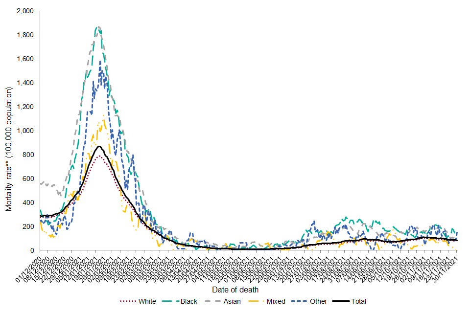 Overall, the age-adjusted annualised mortality rate from 1 December 2020 onwards was highest among those of Asian or Asian British ethnic groups (annualised rate of 335.2 per 100,000 population per year) followed by those of Black and Black British ethnic groups (annualised rate of 313.7 per 100,000 population per year).