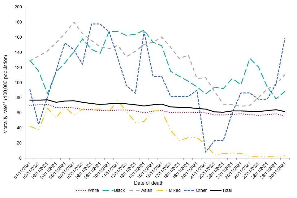 Figure 3.a. Seven-day rolling average age-adjusted annualised mortality rates** (per 100,000 population) in laboratory-confirmed cases of COVID-19 by ethnicity***±, 1 December 2020 to 30 November 2021†