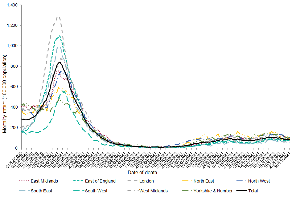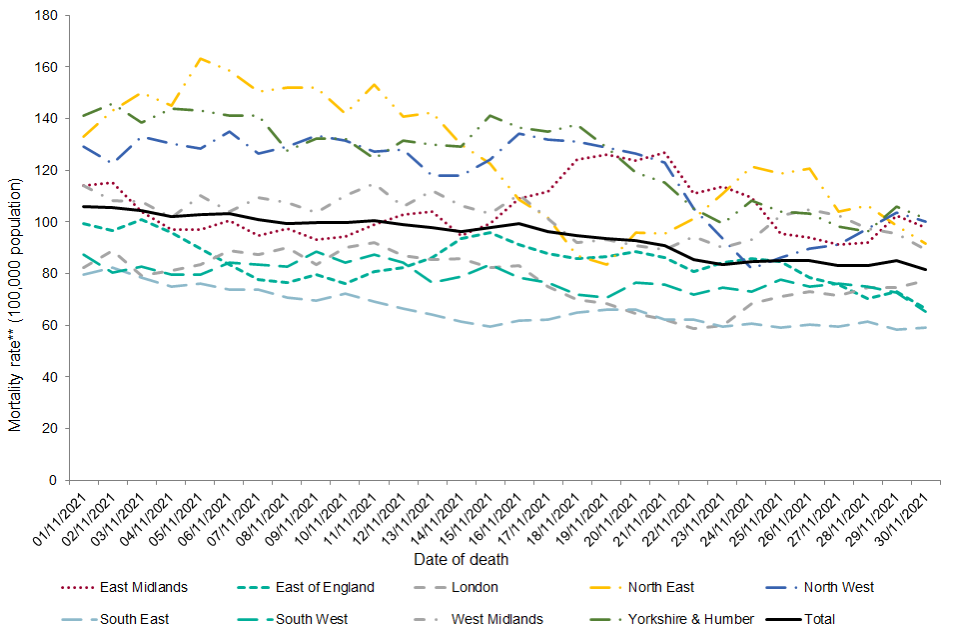 Since 1 December 2020, the annualised mortality rate was highest in the London (199.0 per 100,000 population per year), followed by West Midlands (182.5 per 100,000 population per year) and the East of England (175.8 per 100,000 population per year). The lowest mortality rate was seen in the South West (96.0 per 100,000 population per year). In November 2021, the highest annualised mortality rate was seen in Yorkshire and Humber (9.8 per 100,000 population per year).