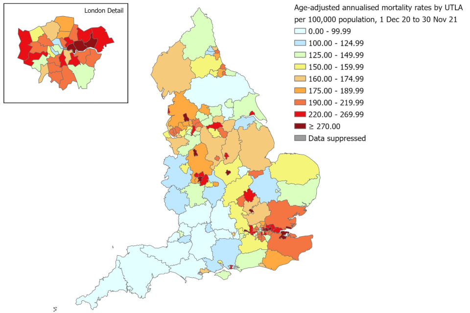 Figure 6.a. Age-adjusted annualised mortality rates** (per 100,000 population) in laboratory-confirmed cases of COVID-19 by upper-tier local authority, 1 December 2020 to 30 November 2021*†