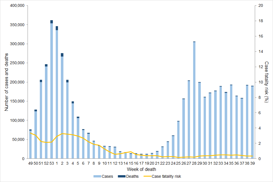 Case fatality risk (CFR) describes the risk of death following a laboratory-confirmed positive COVID-19 test. For this report, CFR has been calculated within 60 days of an individual’s first positive specimen (from PCR, LAMP, and LFD tests) CFR is reported on data 1 December 2020 up to and including 9 October 2021. Cases diagnosed in the last 60 days were excluded from this analysis, due to incomplete follow-up period. Deaths are excluded from the CFR calculation if they cannot be linked to laboratory-confirmed COVID-19 case data.