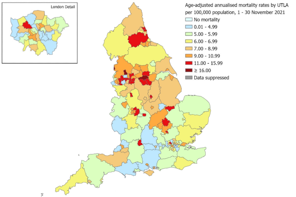Mortality rates by region, local authority, sex, ethnic group and Index of Multiple Deprivation (IMD) have been age-standardised to account for the different age distributions within different populations.
