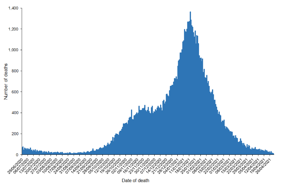 In the same period, there have been 90,931 deaths in persons with laboratory-confirmed COVID-19. This represents a crude mortality rate of 161.6 per 100,000 population. From 29 June 2020 onwards, the highest recorded number of daily deaths was 1,504 deaths on 19 January 2021.