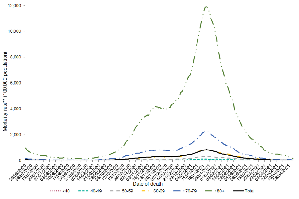 | Age group | Deaths (week 27 onwards*) | Mortality rate** (95% CI) (week 27 onwards*) | Deaths (April 2021) | Mortality rate ** (95% CI) (April 2021) |